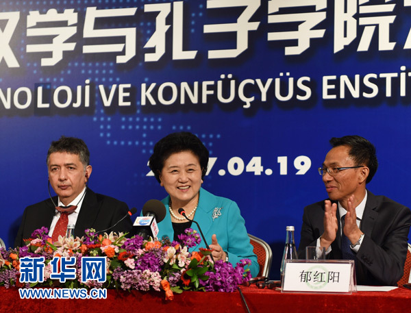 4月19日,中國(guó)國(guó)務(wù)院副總理劉延?xùn)|(中)在伊斯坦布爾考察土耳其海峽大學(xué)孔子學(xué)院并與部分土耳其漢學(xué)家和孔子學(xué)院師生代表座談。新華社記者賀燦鈴攝