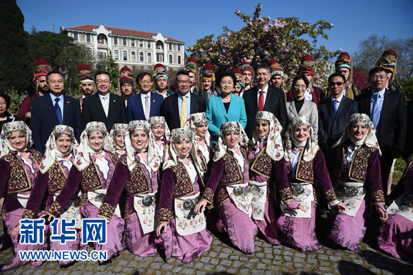 4月19日,在土耳其伊斯坦布爾,中國(guó)國(guó)務(wù)院副總理劉延?xùn)|(二排右五)與海峽大學(xué)師生合影。新華社記者賀燦鈴攝