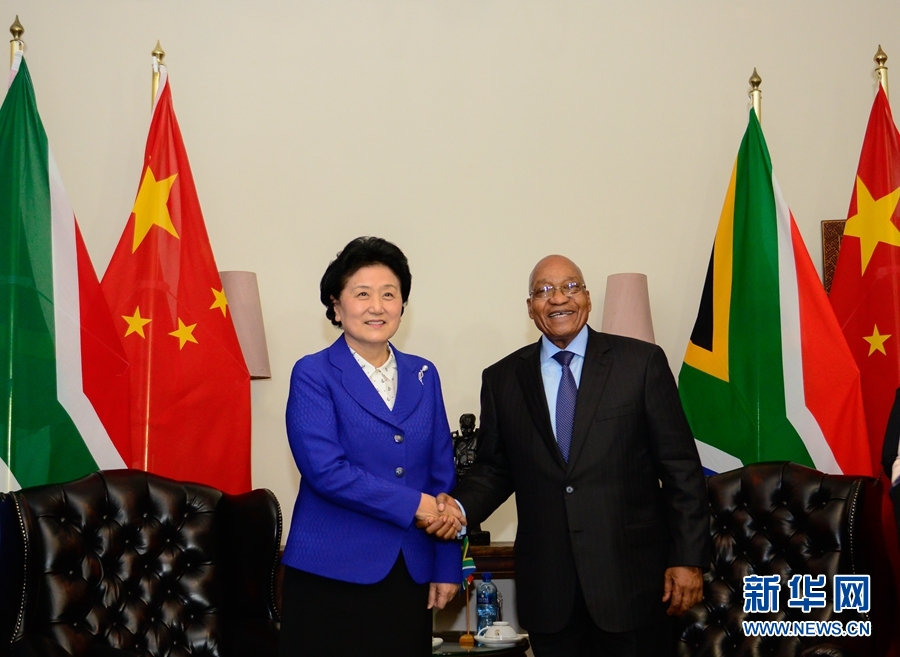 4月25日,南非總統(tǒng)祖馬(右)在比勒陀利亞總統(tǒng)官邸會見正在對南非進(jìn)行正式訪問并出席中南高級別人文交流機制首次會議的中國國務(wù)院副總理劉延?xùn)|。 新華社記者 翟健嵐 攝