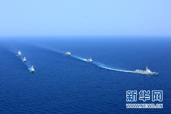 圓滿完成亞丁灣、索馬里海域護航任務(wù)的中國海軍第二十批護航編隊(右)與第二十一批護航編隊分航,駛離亞丁灣海域開始執(zhí)行環(huán)球訪問任務(wù)(2015年8月23日攝)。新華社發(fā)(曾濤 攝)