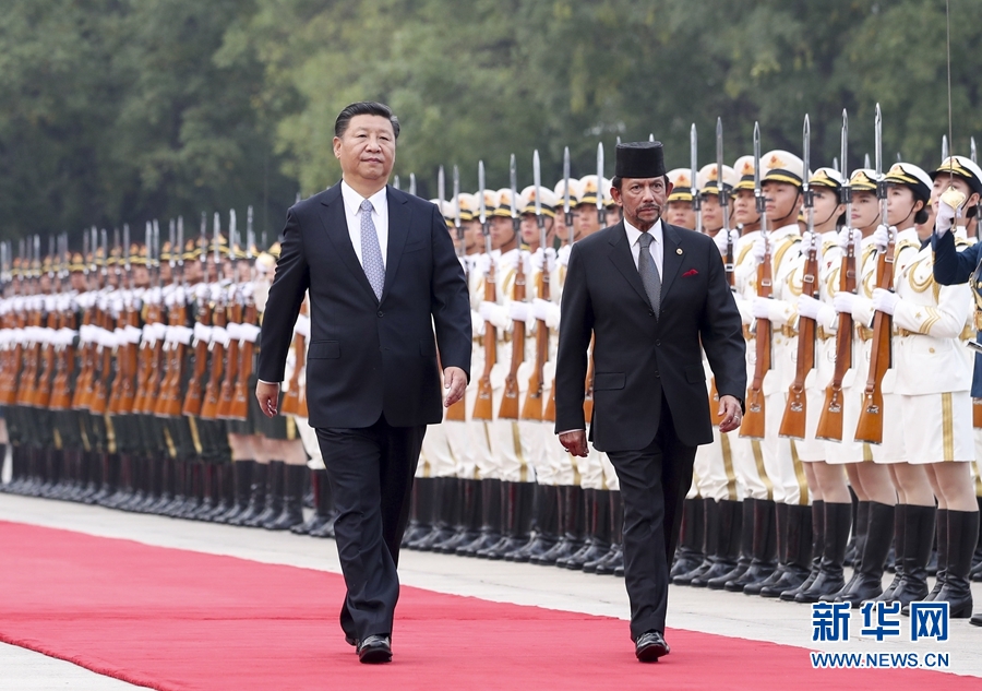 9月13日,國(guó)家主席習(xí)近平在北京人民大會(huì)堂同文萊蘇丹哈桑納爾舉行會(huì)談。這是會(huì)談前,習(xí)近平在人民大會(huì)堂東門外廣場(chǎng)為哈桑納爾舉行歡迎儀式。新華社記者 謝環(huán)馳 攝