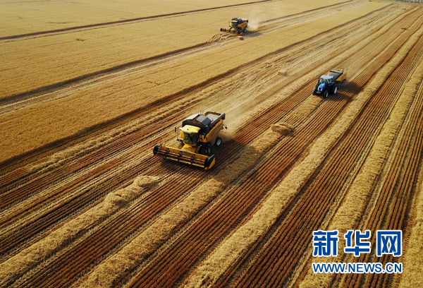 在河南??h中鶴現(xiàn)代農(nóng)業(yè)示范園區(qū)的麥田里,收割機在收獲小麥(6月7日攝)。新華社記者 李安 攝