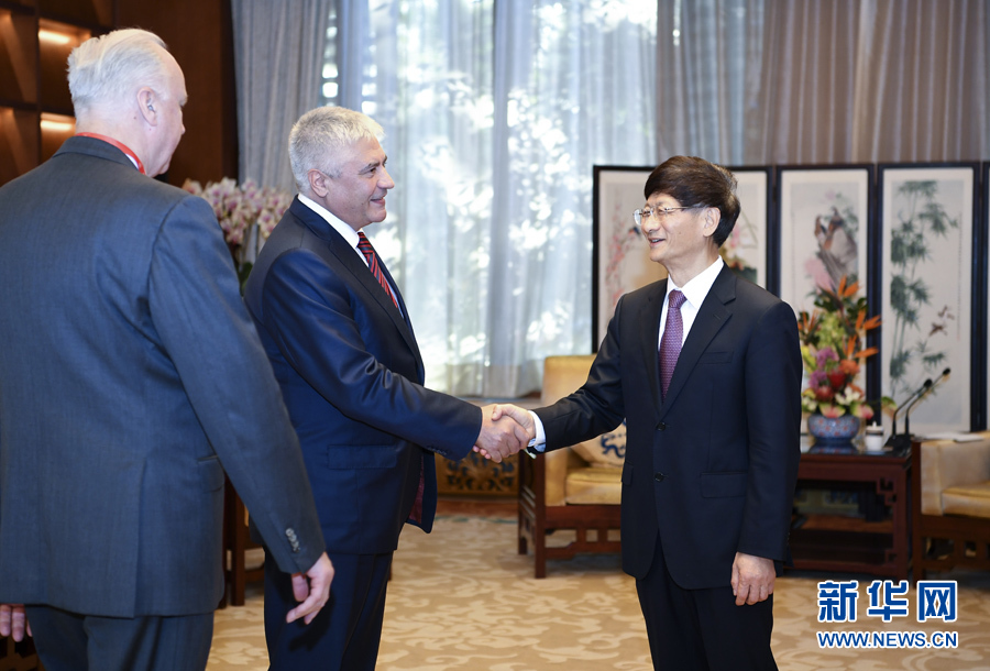 9月26日,中共中央政治局委員、中央政法委書記孟建柱在北京會(huì)見來華出席國(guó)際刑警組織第86屆全體大會(huì)的俄羅斯內(nèi)務(wù)部長(zhǎng)科洛科利采夫(左二)和俄聯(lián)邦調(diào)查委員會(huì)主席巴斯特雷金(左一)。新華社記者 張領(lǐng) 攝