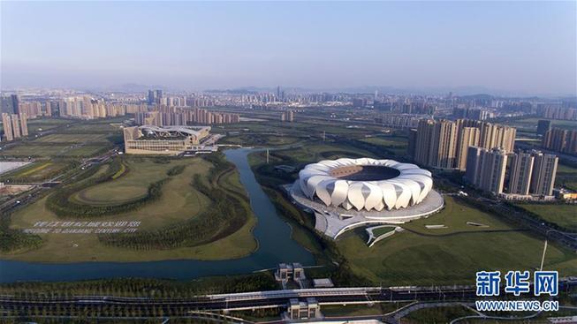 俯瞰浙江杭州奧體中心主體育場(chǎng)和杭州國際博覽中心(2016年8月25日攝)。新華社記者 鞠煥宗 攝