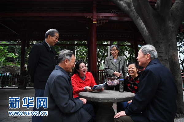 10月10日,重慶市南岸區(qū)南坪街道南湖社區(qū)黨委書記張琦(左三)和社區(qū)居民一起聊家常。 新華社記者 王全超 攝