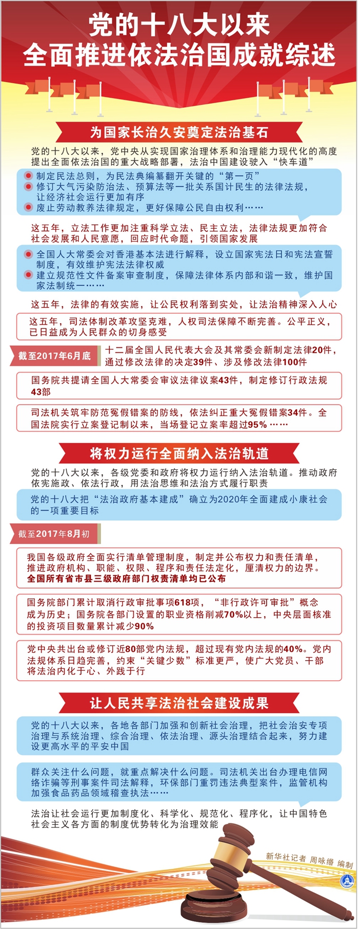 從修改立法法賦予所有設(shè)區(qū)的市地方立法權(quán),到加強(qiáng)規(guī)范性文件違憲違法備案審查;從發(fā)布法治政府建設(shè)實(shí)施綱要,到司法體制改革“猛藥去疴”;從依法懲治腐敗推進(jìn)全面從嚴(yán)治黨,到依法治軍、從嚴(yán)治軍……五年來(lái),改革發(fā)展穩(wěn)定、內(nèi)政外交國(guó)防、治黨治國(guó)治軍,由法治作保障、靠法治來(lái)推進(jìn)。