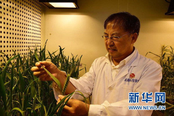在河南科技學院小麥研究中心,小麥育種專家茹振鋼在人工氣候實驗室查看小麥長勢(9月30日攝)。新華社記者馮大鵬攝