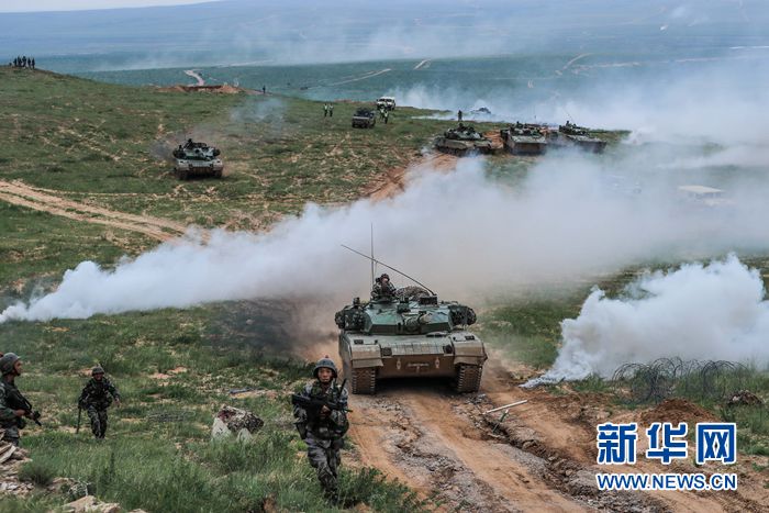 “跨越-2016·朱日和A”演習進入實兵對抗陣地進攻戰(zhàn),這是紅藍雙方首場對抗中紅軍步兵和坦克協(xié)同(2016年7月19日攝)。新華社發(fā)(王佳寅 攝)