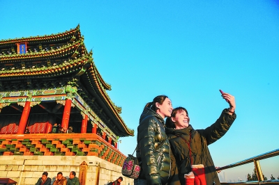 昨天天氣晴朗,在景山萬(wàn)春亭,游客飽覽京城風(fēng)景,愉快留影。實(shí)習(xí)記者 武亦彬攝