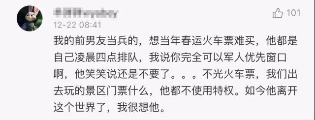@宇:我去年夏天在蘭州站親眼看見一位被召回的軍官著急買票歸隊(duì),被排隊(duì)的人罵沒(méi)素質(zhì),售票人員也不給優(yōu)先。最后我就讓他排我前面了。他們?yōu)閲?guó)家人民付出太多,愛護(hù)軍人,才是愛護(hù)自己。