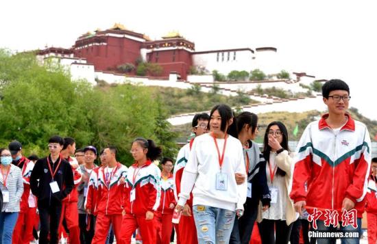 資料圖:西藏布達(dá)拉宮腳下的拉薩中學(xué)師生。中新社記者 李林 攝