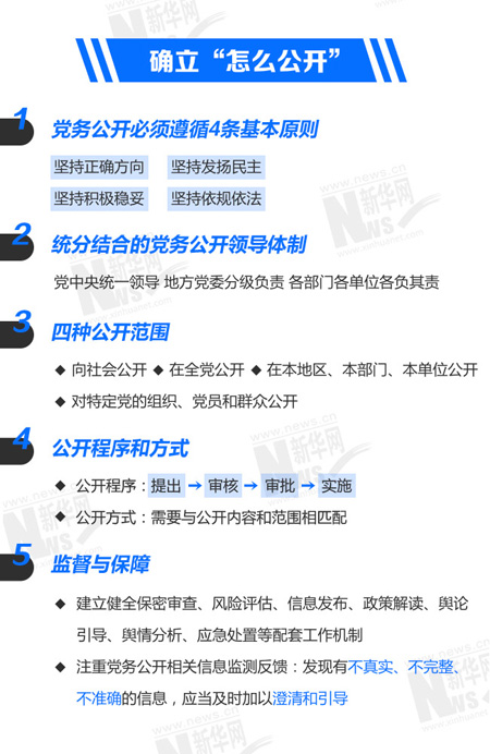 為了保證黨務公開的各項要求落到實處,《條例》要求建立健全保密審查、風險評估、信息發(fā)布、政策解讀、應急處置等配套保障工作機制,注重黨務公開相關(guān)信息監(jiān)測反饋,規(guī)定了工作報告、考核評議、督促檢查和責任追究制度。