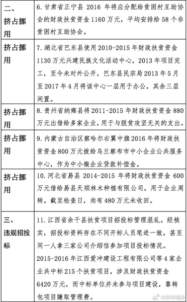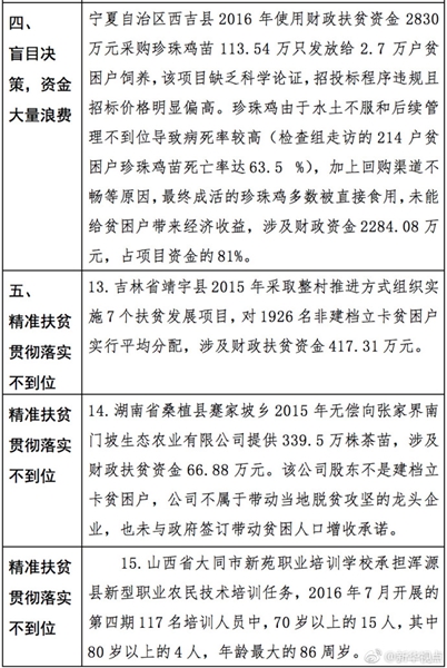 “發(fā)現(xiàn)一起、查處一起、絕不姑息!”財政部監(jiān)督檢查局有關(guān)負責(zé)人指出,此次檢查發(fā)現(xiàn)了一批違法違規(guī)問題,本著“零容忍”態(tài)度已進行了嚴肅處理。從檢查發(fā)現(xiàn)問題中的一些典型案例看,虛報冒領(lǐng)、擠占挪用、違規(guī)招投標、盲目決策導(dǎo)致資金大量浪費、精準扶貧貫徹落實不到位是當(dāng)前濫用扶貧資金的主要問題所在。