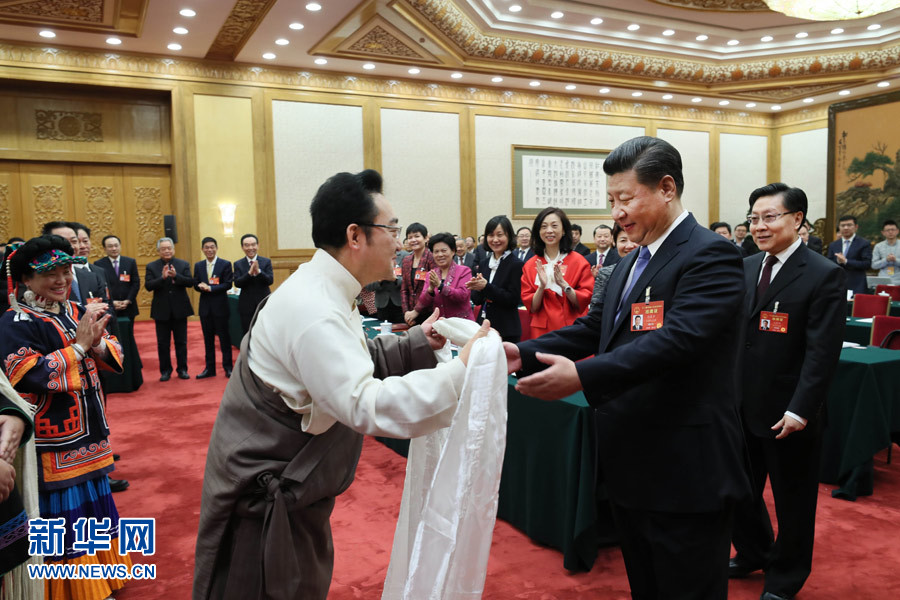 2017年3月8日,習(xí)近平參加十二屆全國(guó)人大五次會(huì)議四川代表團(tuán)的審議。習(xí)近平走進(jìn)會(huì)場(chǎng)時(shí),身著民族服裝的藏族、彝族、羌族代表向總書記問(wèn)好。這是藏族代表獻(xiàn)上潔白的哈達(dá)。新華社記者蘭紅光攝