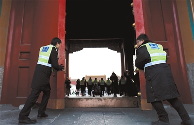 昨日,故宮,保安在進行2017年最后一天的晚清場封門。新京報記者 浦峰 攝