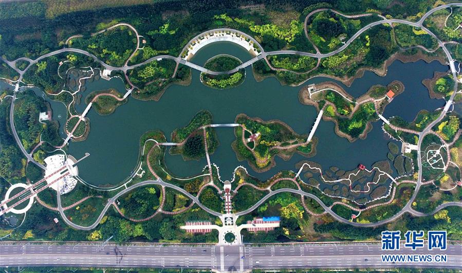 俯瞰天津?yàn)I海新區(qū)臨港經(jīng)濟(jì)區(qū)的臨港生態(tài)濕地公園(2016年10月21日攝)。臨港生態(tài)濕地公園多年來對工業(yè)區(qū)內(nèi)的污水和雨水進(jìn)行凈化處理和循環(huán)利用,污水經(jīng)二次處理達(dá)到1級(jí)A標(biāo)準(zhǔn),用于綠植灌溉等市政用水,減少污染物入海。新華社記者 岳月偉 攝