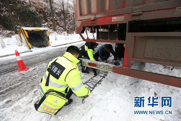 湖北五峰土家族自治縣仁和坪鎮(zhèn)“路長(zhǎng)”高恩強(qiáng)(左一)在楊柳池村到金家垴路段指導(dǎo)過往貨車安裝防滑鏈(1月5日攝)。新華社記者 王自宸 攝