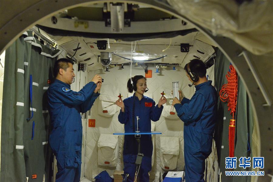 2013年5月22日,航天員王亞平(中)、聶海勝(右)、張曉光在模擬天宮一號(hào)組合體內(nèi)進(jìn)行太空授課訓(xùn)練。新華社發(fā)(朱九通 攝)