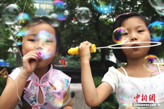 圖為兩名小女孩在南昌八一廣場上吹泡泡(資料圖)。中新社發(fā) 劉占昆 攝