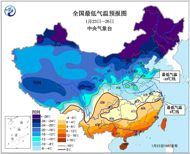 1月23日至月底,影響我國(guó)的冷空氣頻繁且勢(shì)力較強(qiáng)。23-26日,受強(qiáng)冷空氣影響,中東部大部地區(qū)自北向南先后有4~5級(jí)偏北風(fēng),陣風(fēng)6~7級(jí);黃淮及其以南地區(qū)氣溫下降6~8℃,部分降溫幅度可達(dá)10~12℃。在此期間,中東部大部地區(qū)日平均氣溫較常年同期偏低2~5℃,部分地區(qū)偏低6℃以上。最低氣溫0℃線將南壓至浙江北部、江西北部、湖南南部至貴州南部一線,-10℃線位于甘肅東南部、陜西中部到河北南部、山東中部一線。我國(guó)東部和南部海區(qū)先后有6~8級(jí)、陣風(fēng)9~10級(jí)大風(fēng)。