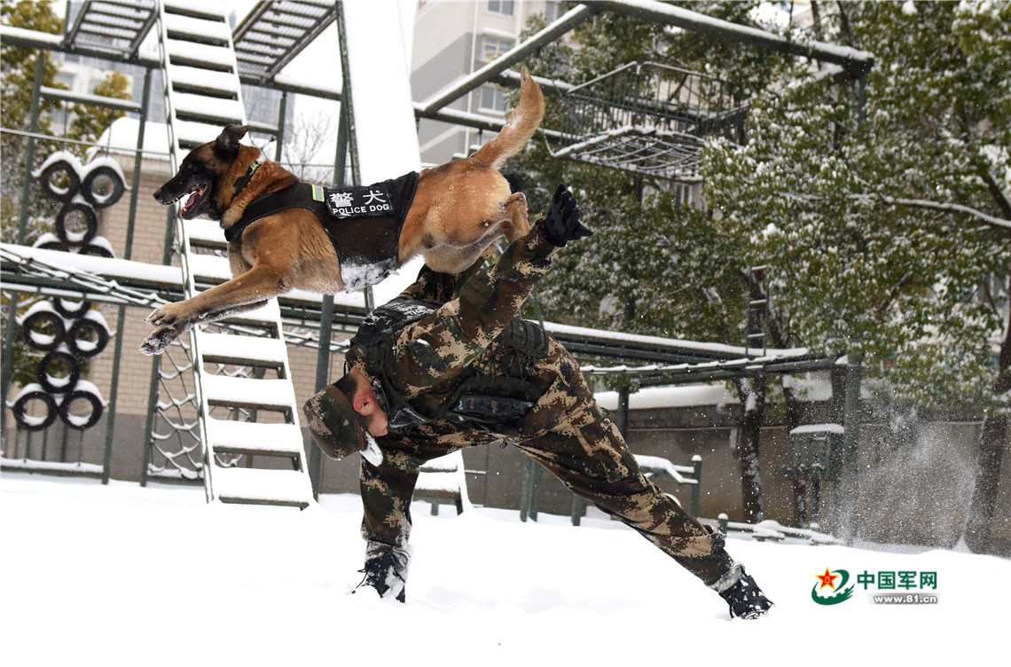 1月27日,武警安徽總隊(duì)機(jī)動(dòng)支隊(duì)警犬班班長(zhǎng)王營廣與警犬“魯克”進(jìn)行人犬結(jié)合訓(xùn)練。
