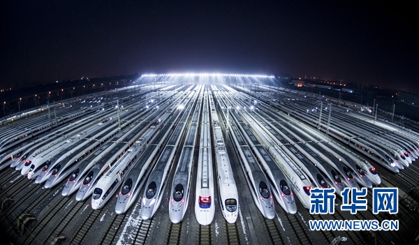 2018年2月1日凌晨,動車組??吭谖錆h動車段的存車線上,準(zhǔn)備進行檢修和保溫作業(yè)。新華社記者 肖藝九 攝