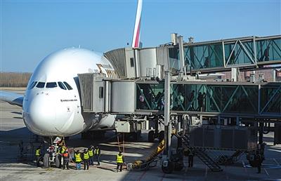 2月7日,一架飛機到達后,首都機場博維公司工作人員操作客梯廊橋與飛機連接后下客。圖片來源:新京報