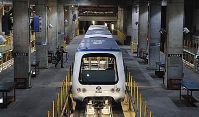 為了保證小火車安全運行,在位于地下十六米的首都機場博維公司維修車間,原本三節(jié)一組的列車被拆分開,十余位工作人員正在對捷運列車進行例行檢修。隨著千斤頂?shù)木徛?,一?jié)車廂被抬升到離地一米的高度,兩名工作人員持手電對車底進行檢修。工作人員介紹,在列車?yán)塾嬓旭傔_9600公里以上時都要進行一次系統(tǒng)檢修。