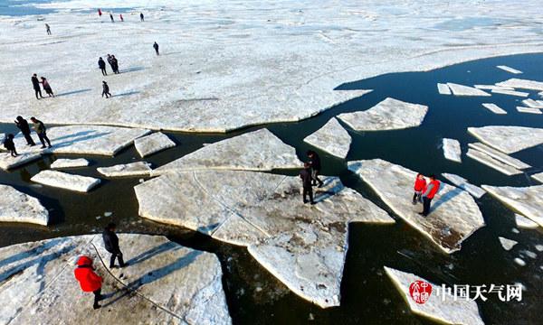 遼寧大連氣溫連續(xù)回升,海冰融化,游人冒險踏冰。(圖/呂文正)