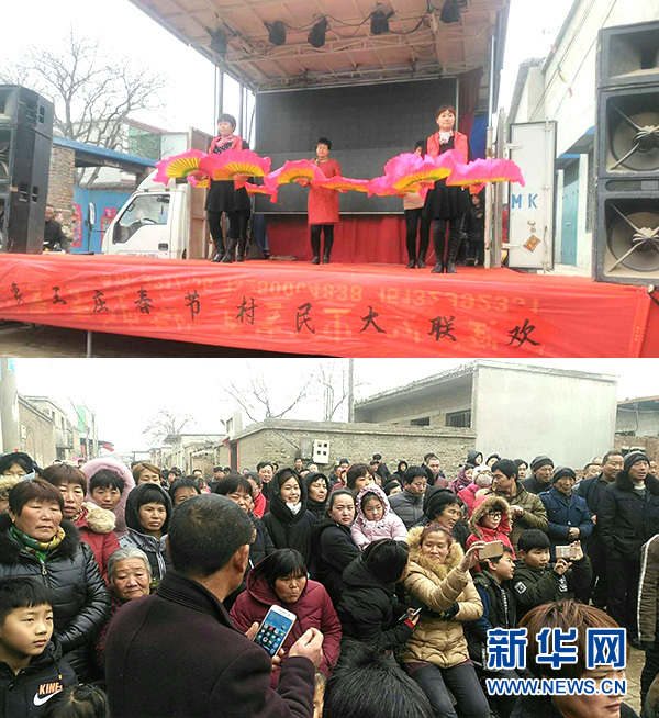 拼版照片:上圖為,2月21日,河北任縣象王莊舉行“春節(jié)村民大聯(lián)歡”;下圖為,“春節(jié)村民大聯(lián)歡”吸引眾多村民觀看。新華網(wǎng)發(fā)