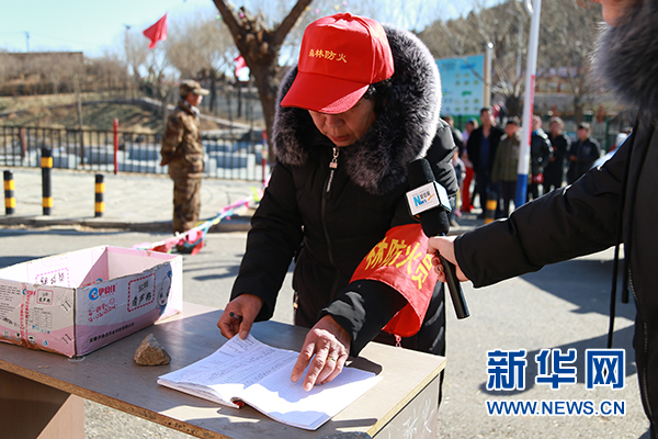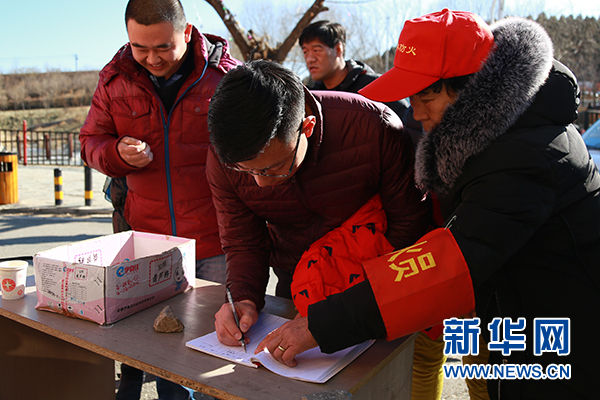 上山游客做登記并將打火機暫存給護林員。新華網(wǎng) 周靖杰 攝