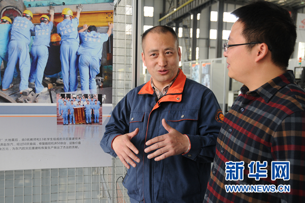 胡明華(左)與團(tuán)隊(duì)成員一起向記者回憶2008年他們援助東汽災(zāi)后重建工作的情形。新華網(wǎng) 聶晨靜 攝