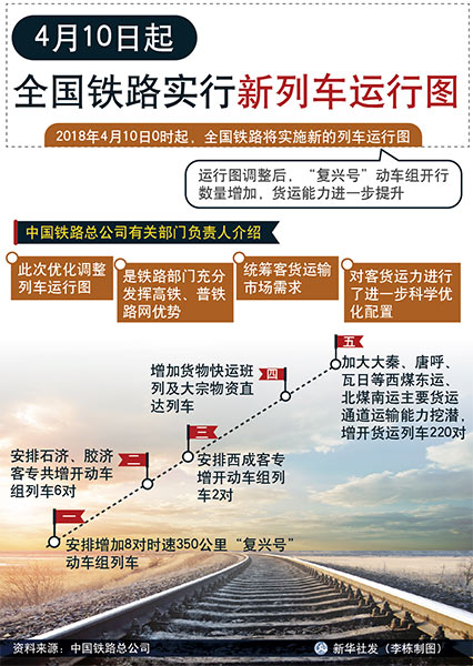 新華社北京4月2日電(記者齊中熙)記者從中國鐵路總公司獲悉,2018年4月10日0時起,全國鐵路將實施新的列車運行圖。運行圖調(diào)整后,“復興號”動車組開行數(shù)量增加,貨運能力進一步提升。