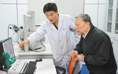陳清如院士(右)在指導(dǎo)實驗。資料圖片