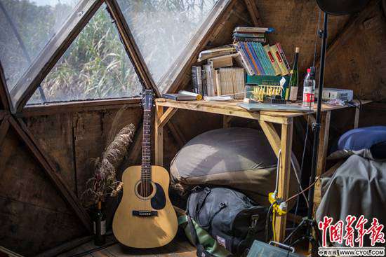夫妻倆居住的圓頂木屋距離村子幾百米遠(yuǎn),是和朋友們一起搭建的。屋里的電氣設(shè)備一應(yīng)俱全,太陽(yáng)能發(fā)電在村子停電時(shí)仍能應(yīng)付日常消耗。屋外停著一輛二手的紅色兩座跑車,用來(lái)載人拉貨。與嶗山的“自給自足實(shí)驗(yàn)”不同,這些只有在現(xiàn)代工業(yè)社會(huì)才能量產(chǎn)的物品成了山中生活的得力工具。