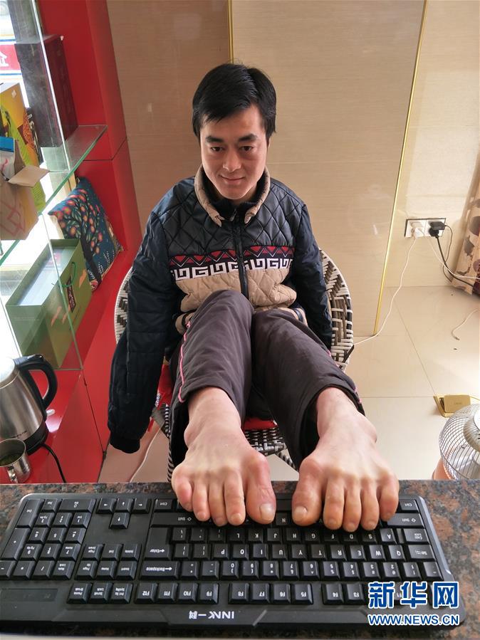 陳茲方用腳創(chuàng)造著生活——他用10個(gè)腳趾每分鐘敲出五六十個(gè)字、熟練處理圖像、剪輯視頻……兩年來,他就這樣不辭艱難地打理網(wǎng)店,實(shí)現(xiàn)夢想:把鄉(xiāng)親們的土特產(chǎn)賣出去。