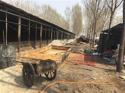 大院除了破敗的大棚,沒(méi)有任何養(yǎng)殖設(shè)施。新京報(bào)記者現(xiàn)場(chǎng)看到,一名養(yǎng)殖戶(hù)把清理出的糞便和污水裝進(jìn)小推車(chē),然后倒進(jìn)院后的一條水溝里。