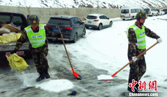 武警某部交通三支隊駐左貢縣中隊官兵向結(jié)冰路面拋撒工業(yè)鹽 路凱 攝