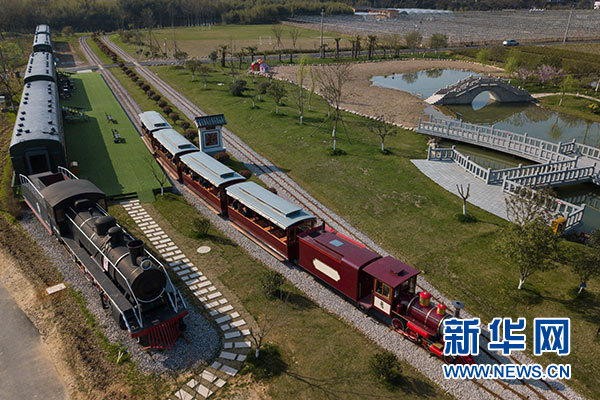 游客乘坐觀(guān)光小火車(chē)從浙江省安吉縣魯家村的休閑驛站邊駛過(guò)(3月23日無(wú)人機(jī)拍攝)。新華社記者 黃宗治 攝