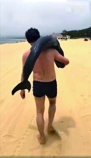 昨天,網(wǎng)絡(luò)流傳的多段視頻顯示,一名身穿泳衣的男子疑似背上扛著一只海豚在沙灘行走(見(jiàn)圖)。多位網(wǎng)友回復(fù)稱,該事件發(fā)生于廣東陽(yáng)江市海陵島沙灘附近,涉事男子直接把海豚扛走。