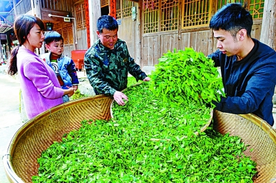 在福建省武夷山國家級自然保護區(qū)內(nèi)的桐木村,回鄉(xiāng)創(chuàng)業(yè)的大學(xué)畢業(yè)生徐建(右)攤晾鮮茶葉。新華社發(fā)
