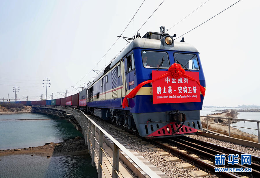 發(fā)往比利時(shí)安特衛(wèi)普的國際集裝箱班列從河北唐山港京唐港區(qū)駛出(4月26日攝)。唐山港京唐港區(qū)當(dāng)日正式開通中歐國際集裝箱班列。新華社記者 楊世堯 攝