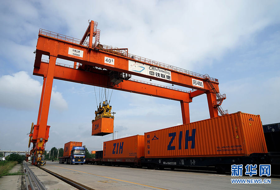 在鄭州鐵路集裝箱中心站,工作人員使用大型門吊為中歐班列(鄭州)裝載貨物(2017年8月2日攝)。新華社記者 李安 攝
