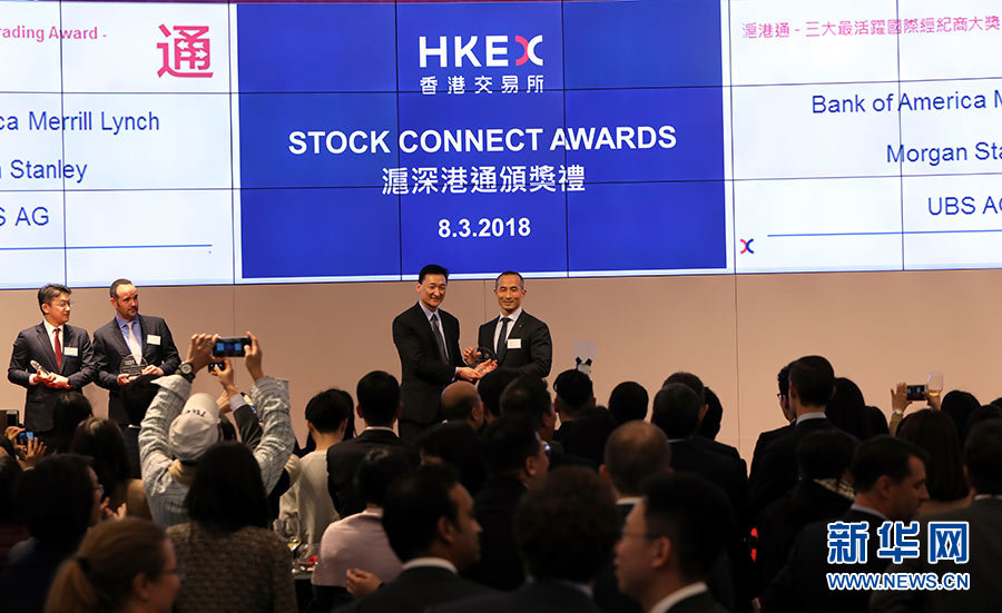 香港交易所舉辦2017年度“滬深港通”頒獎(jiǎng)禮,表揚(yáng)主要經(jīng)紀(jì)商于2017年參與“滬深港通”互聯(lián)互通股票交易機(jī)制所取得的成績(3月8日攝)。新華社記者 李鵬 攝
