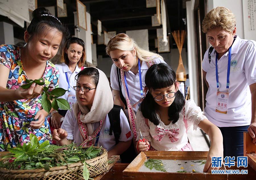 2017年8月15日,“魅力非遺——第二屆上海合作組織夏令營·非物質(zhì)文化遺產(chǎn)交流體驗”活動在貴州省黔東南苗族侗族自治州丹寨縣萬達小鎮(zhèn)舉行。這是外國手工藝人在古法造紙體驗館了解花草紙的制作過程。新華社發(fā)(黃曉海 攝)