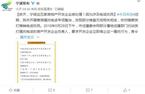 2018年5月29日下午,寧波市住建委會(huì)同部分屬地住建部門約談?chuàng)艽蝌}擾電話的房產(chǎn)開發(fā)企業(yè)負(fù)責(zé)人,要求開發(fā)企業(yè)立即停止這一騷擾行為,責(zé)令其限期整改,并處以暫停網(wǎng)簽、延緩發(fā)放預(yù)售許可證等相關(guān)處罰措施。