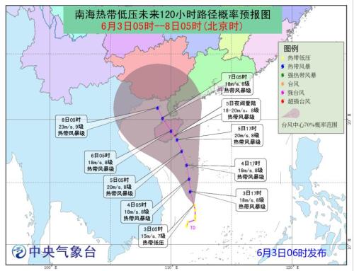 據(jù)中央氣象臺消息,預(yù)計3日夜間至5日,西南地區(qū)東部、江南、華南等地自西向東將有一次較強降水天氣過程;南海及華南等地將有較大風(fēng)雨天氣,中央氣象臺3日06時繼續(xù)發(fā)布熱帶低壓預(yù)報。