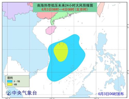 中央氣象臺3日06時繼續(xù)發(fā)布熱帶低壓預(yù)報:南海熱帶低壓的中心今天5點鐘位于我國西沙永興島偏南方大約410公里的南海南部海面上(北緯13.2度、東經(jīng)111.9度),中心附近最大風(fēng)力有7級(15米/秒),中心最低氣壓為1002百帕。