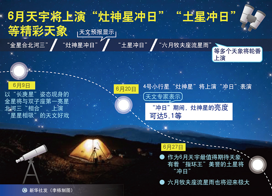 6月夜空,天象精彩。6月9日,以“長(zhǎng)庚星”姿態(tài)現(xiàn)身的金星將與雙子座第一亮星北河三“相合”,上演“星星相吸”的天文好戲。此外,4號(hào)小行星“灶神星”6月20日將上演“沖日”表演;有著“指環(huán)王”美譽(yù)的土星將于6月27日“沖日”;巧合的是,六月牧夫座流星雨也將于27日迎來極大。