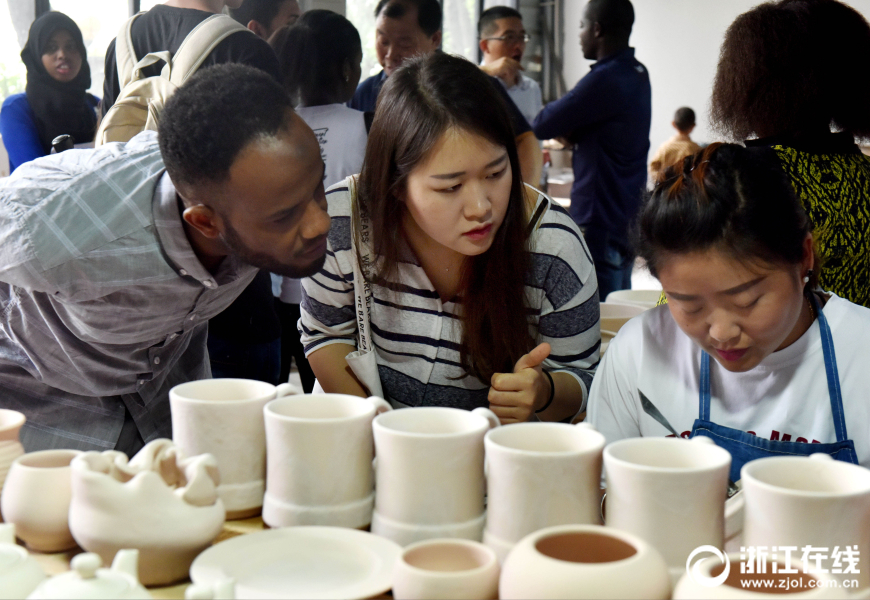2018年6月3日,來(lái)自30多個(gè)國(guó)家的70多名留學(xué)生,在武義漢坊婺窯認(rèn)真學(xué)習(xí)修坯、上釉等環(huán)節(jié)。